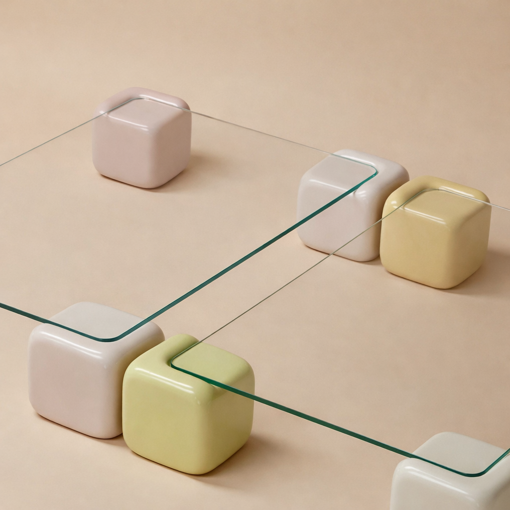 A playful glass-top table supported by glossy pastel cube legs for a modern touch.