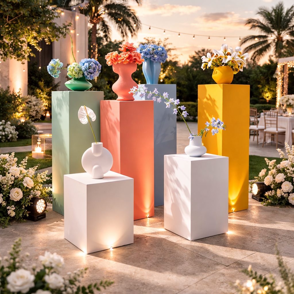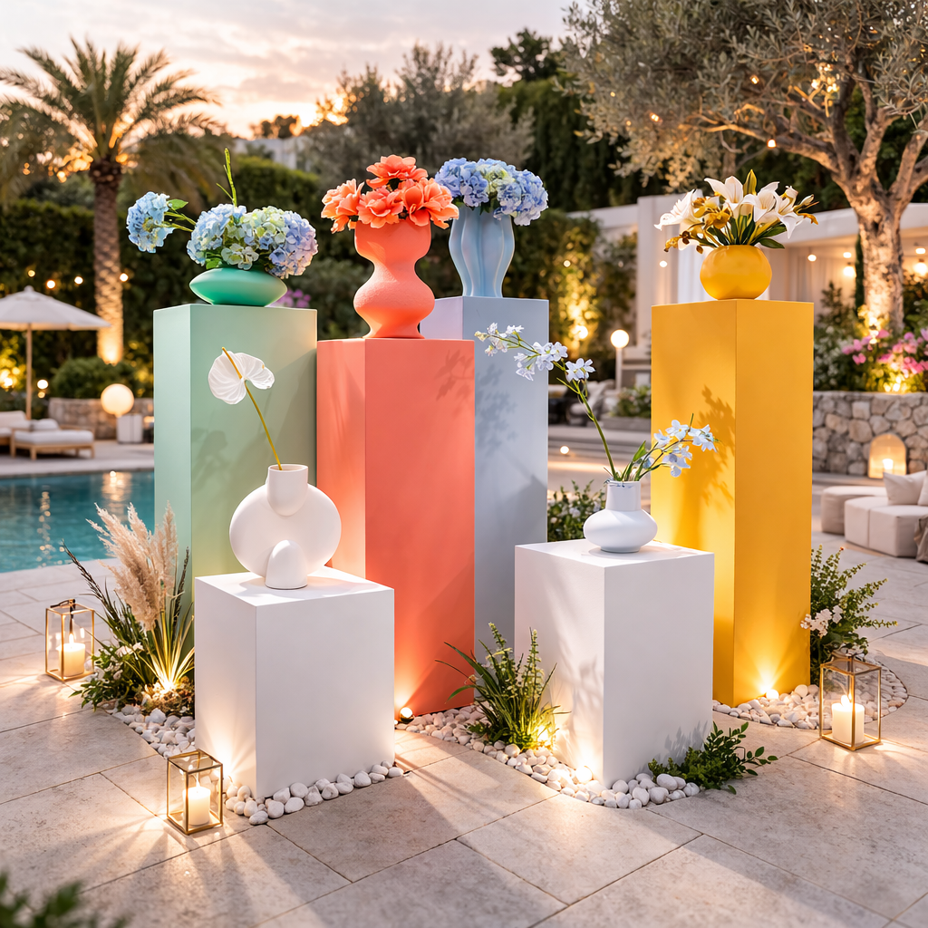 A collection of vibrant display pedestals perfect for showcasing vases, art pieces, and floral arrangements in a playful, modern way.