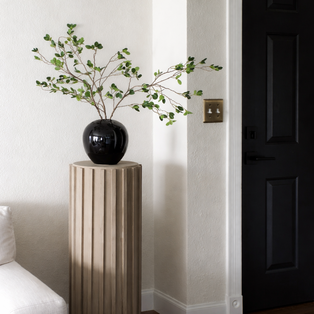 A tall, sculpted pedestal with elegant vertical grooves, perfect for showcasing vases, plants, or art pieces.
