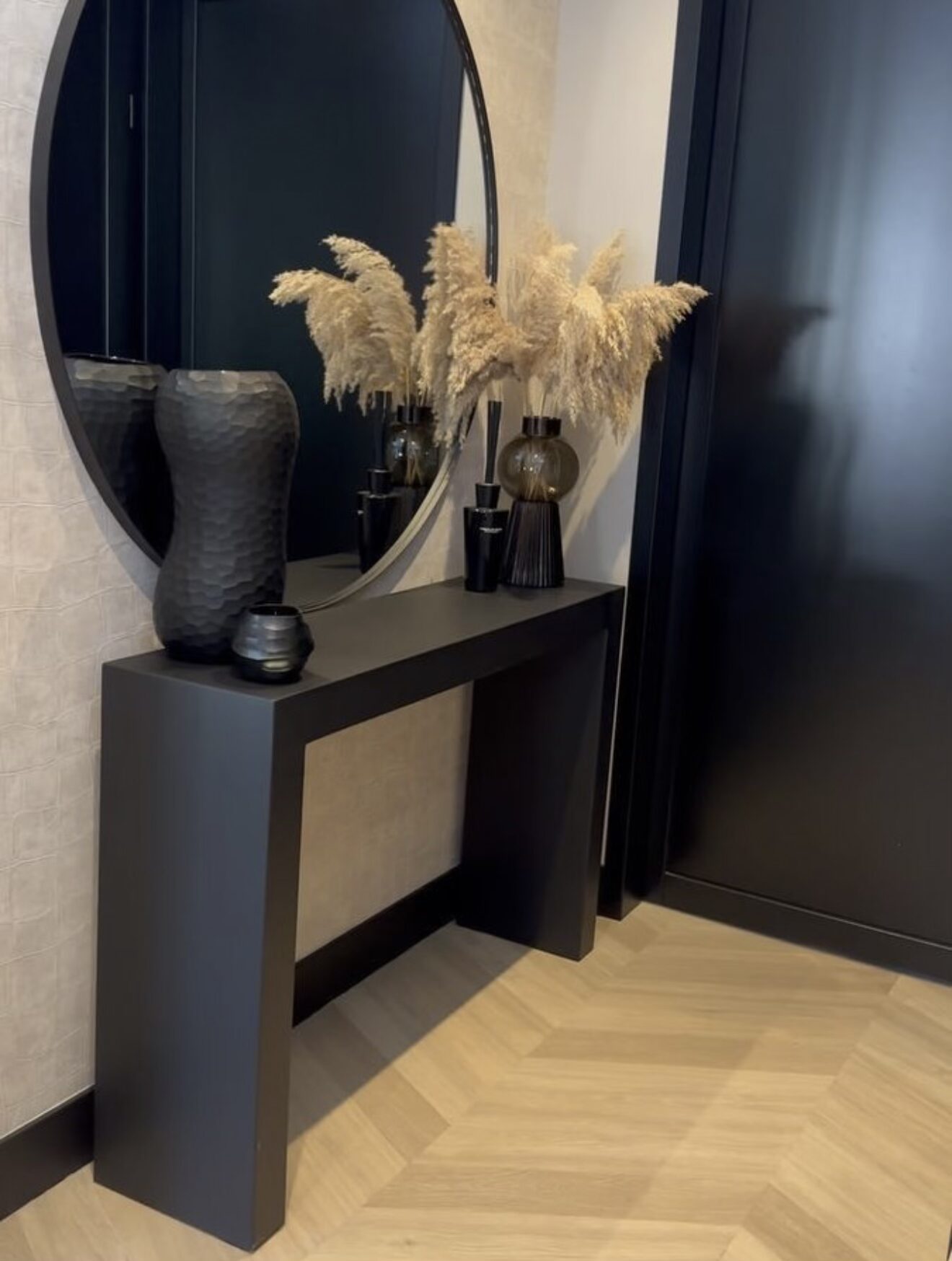 A sleek matte black console designed for modern, minimal styling with a refined touch.