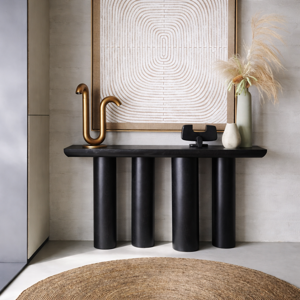 A bold black console with solid cylindrical bases, bringing strength and refined luxury to any space.